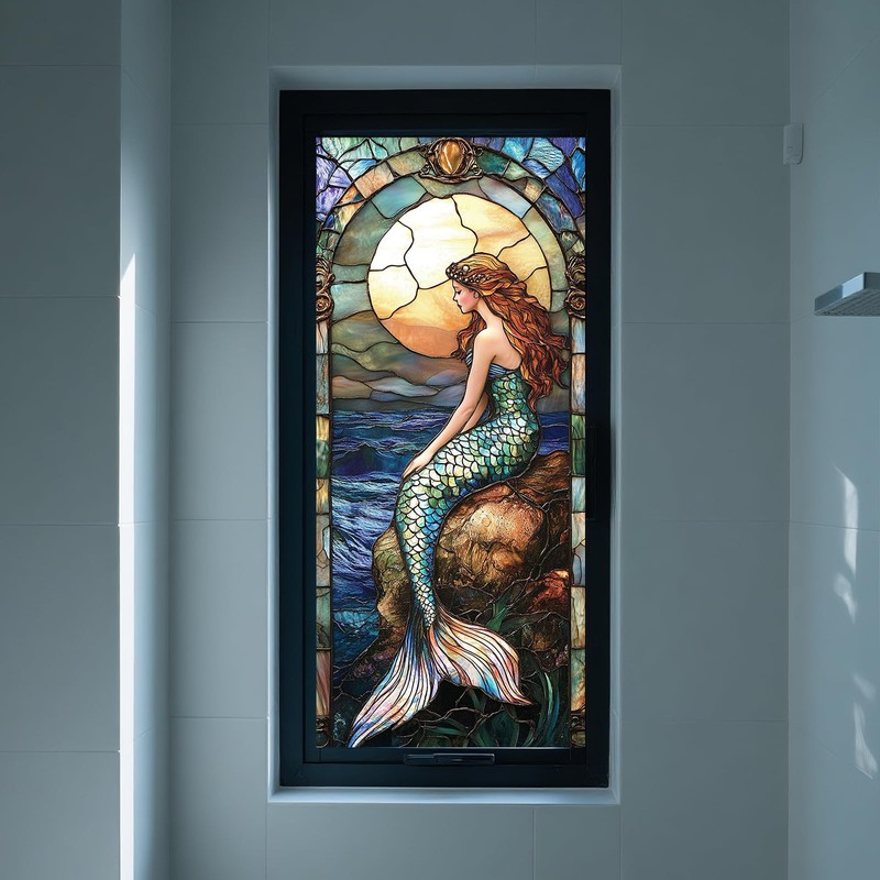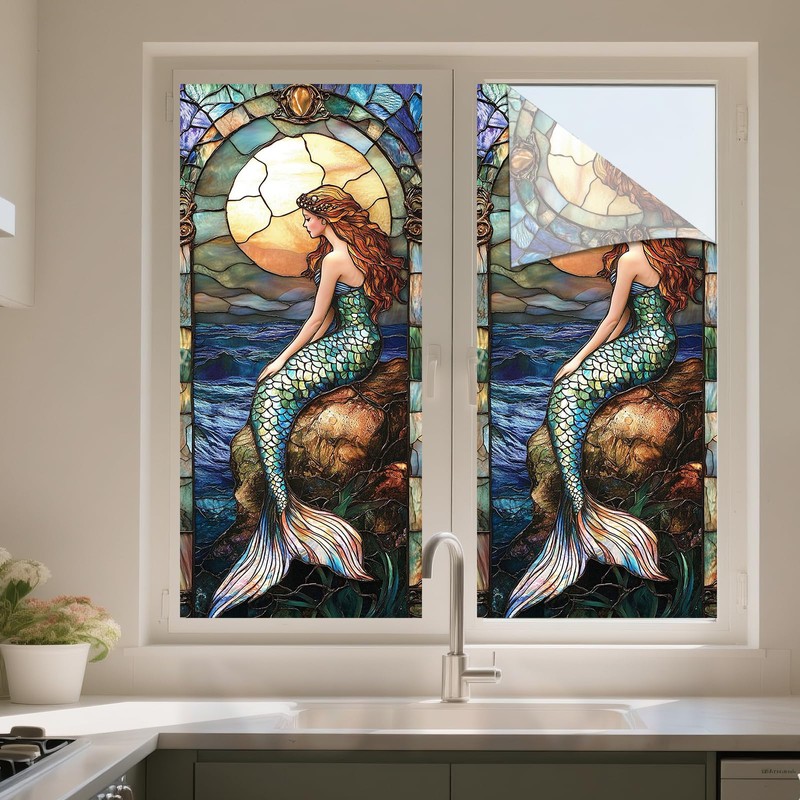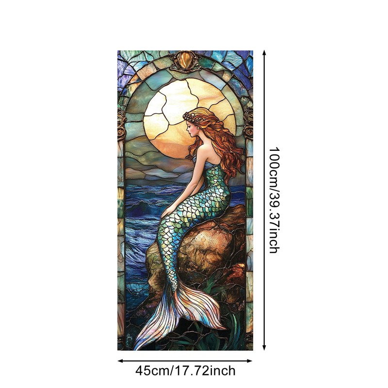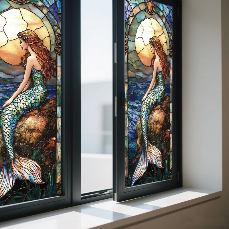 - Stained Glass Window Film Mermaid Design: Add a touch of fantasy and elegance to your space with this mesmerizing mermaid design. The stained glass effect enhances any window or glass partition, creating a beautiful atmosphere while ensuring privacy and soft light diffusion.