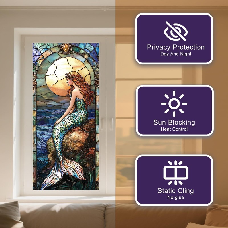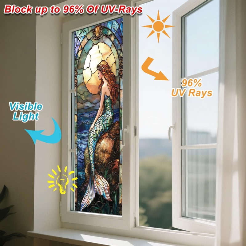 - Sun Blocking Decor for Home Office Windows and Door Glass Partitions: Protect your interior from harmful UV rays while enhancing your space with this sun-blocking stained glass film. Its unique mermaid design is perfect for any home or office looking for stylish privacy and sun protection.