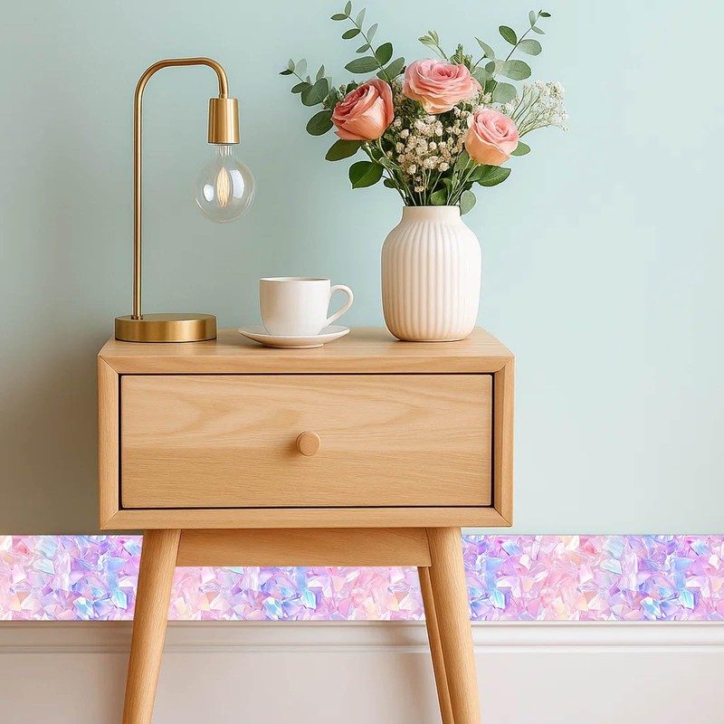 - Elegant Pastel Crystal Design: Add a touch of elegance to your space with this Pastel Crystal Wallpaper Border. The soft pastel tones and sparkling crystal-like texture accent create a refined look, ideal for bathrooms, laundry rooms, and pool areas.