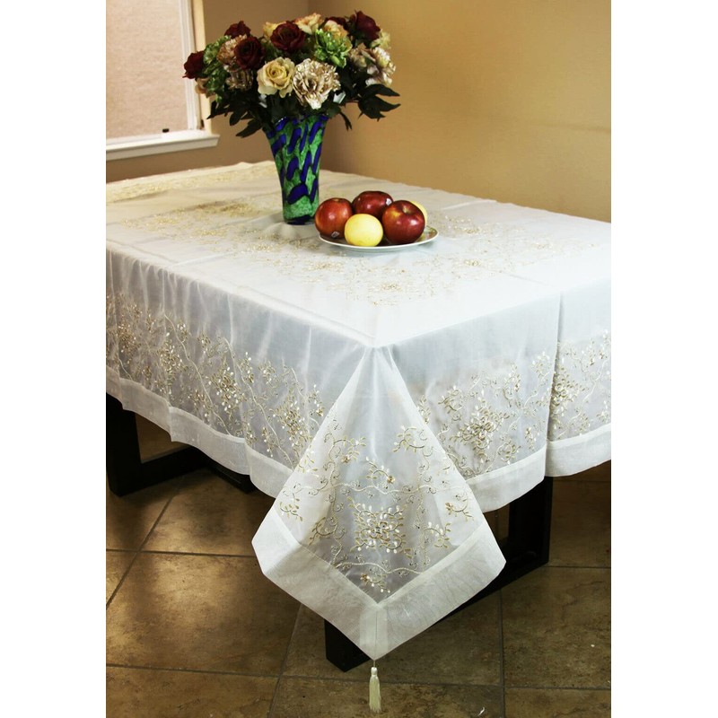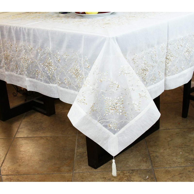 Ivory 72x126" Sheer Embroidered Gold Rhine Stone Tassel Sheer Tablecloth Elegant Washable Table Cloth Decorative Fabric Table Cover for Dining Table Buffet Parties