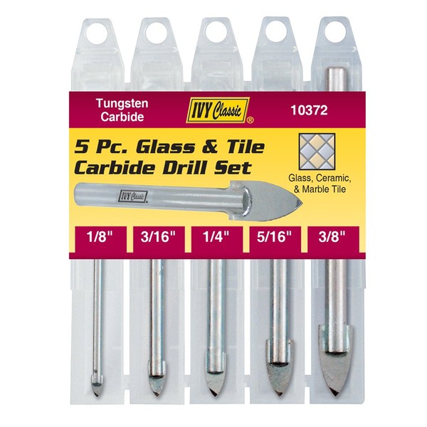 IVY Classic Industries is dedicated to producing a comprehensive, quality line of power tool accessories and hand tools. The IVY Classic 5-Piece Glass and Tile Drill Bit Set features bits that are designed for drilling glass, ceramic, and marble tile. The tungsten carbide spear points cut round holes without chipping or breaking the material. These bits are intended for rotation drilling only, not for percussion drilling, and slow drilling speeds are recommended for optimal performance. The 5-Piece Set comes in a sturdy plastic case and includes 1/8, 3/16, 1/4, 5/16, and 3/8-inch bits.