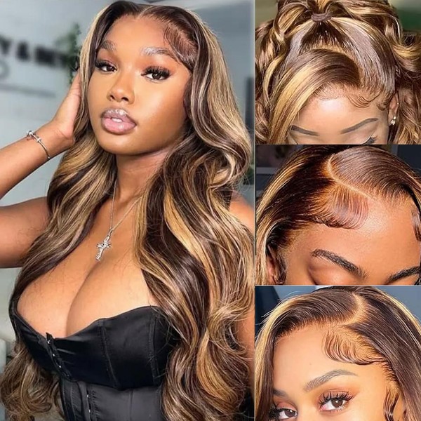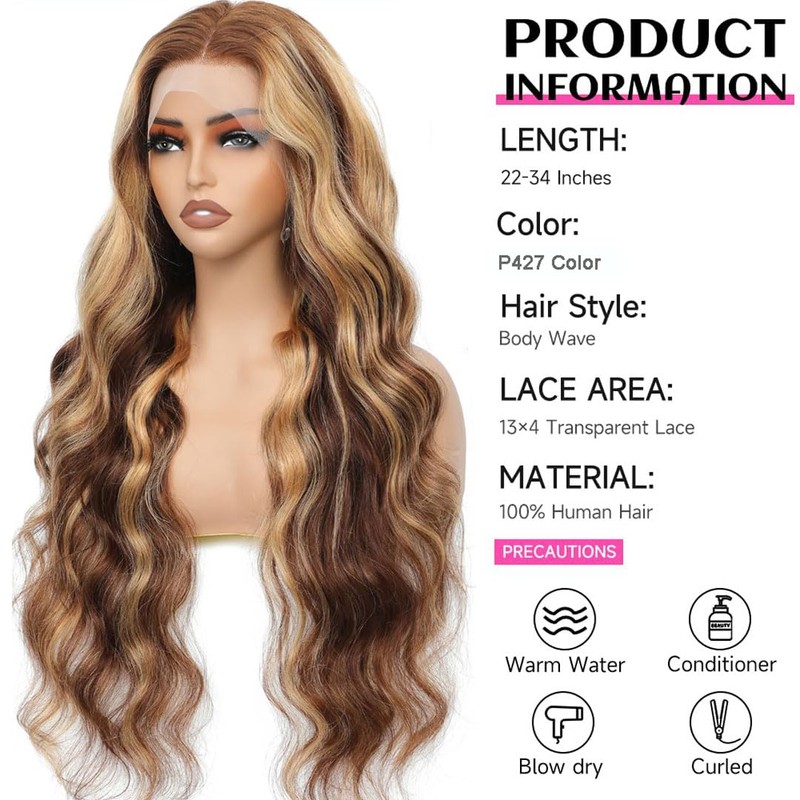 - 1.Highlight 13x4 Body Wave Lace Front Wig Premium Material: 100% Brazilian Human Hair ,Collected by young girl , clean and healthy , 180 Density, 4/27 Highlight Color. Healthy, Soft and Tangle-Free without any Shedding, Durability, Shinny and Smooth