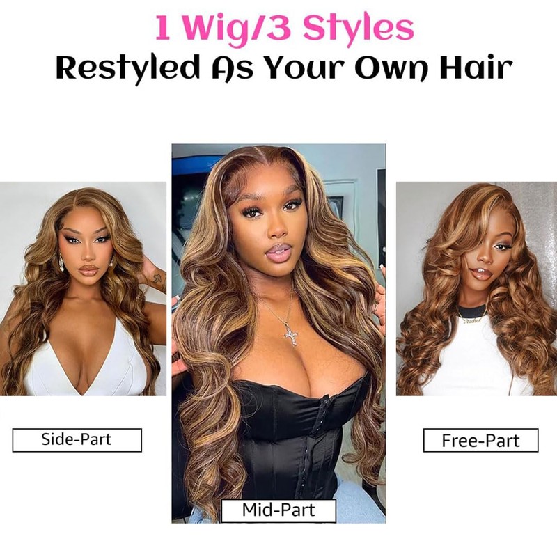 - 4.13x4 HD Lace Frontal Wig: Ear to ear 13x4 lace front wig is glueless wigs, it has a bigger parting space, you can do middle part and side part by your own wish. This highlight wig is pre plucked with baby hair, the knots are invisible, suitable for different color of skins, that makes your hairline looks more natural just like your own hair.