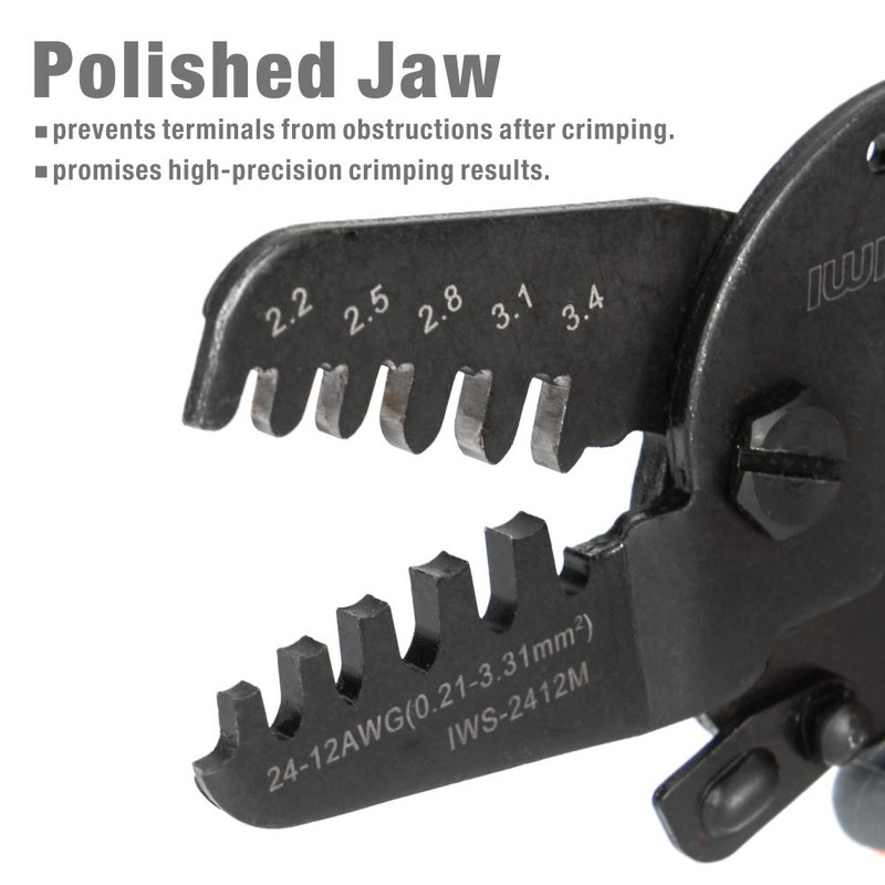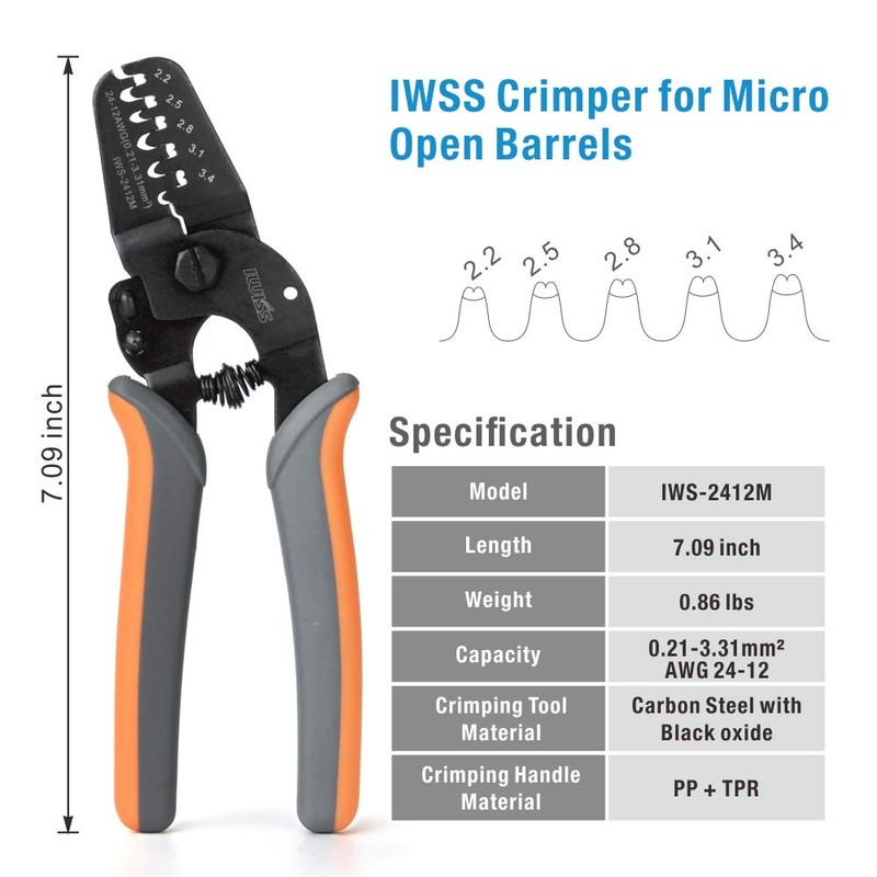 - Capability: 0.21-3.31m㎡, AWG 24-12. IWS-2412M does many sizes like U-barrel or stamped style terminals. Perfect crimps pins such as Molex KK,Picoblade series, etc.
