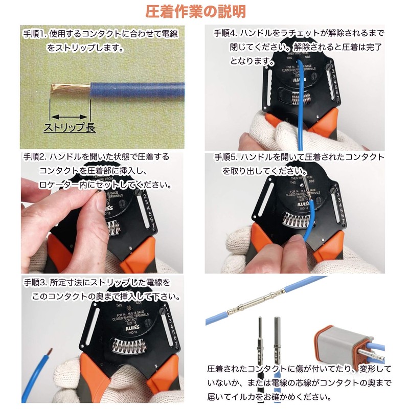 - Features: 1. Crimping from 4 directions simultaneously, making it strong and reliable crimp. 2. You can easily set the value by simply sliding it to fit the gauge. 3. Set the terminals accurately in the locator