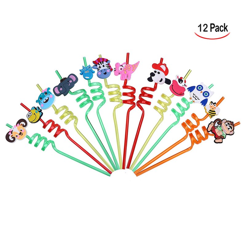 iwobi 12 Pcs Animal Curly Straws,Reusable Plastic Curly Novelty Straws for Kids Birthday Party