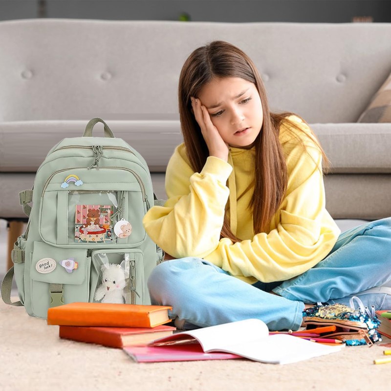 iwobi Kawaii Backpack,Large Capacity Cute Bear Accessories Backpack,School Backpacks Multi Pocket Bookbags For Teen Girls(Green)