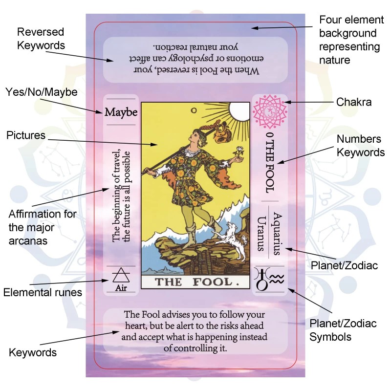[Tarot Cards with Meanings on Them]:I think this tarot deck is the best choice for you, it makes it easier to use. Each card has a comprehensive message, contains Keywords, Reversed, Chakra, Planet, Zodiac, Element, Yes or No, Affirmations...