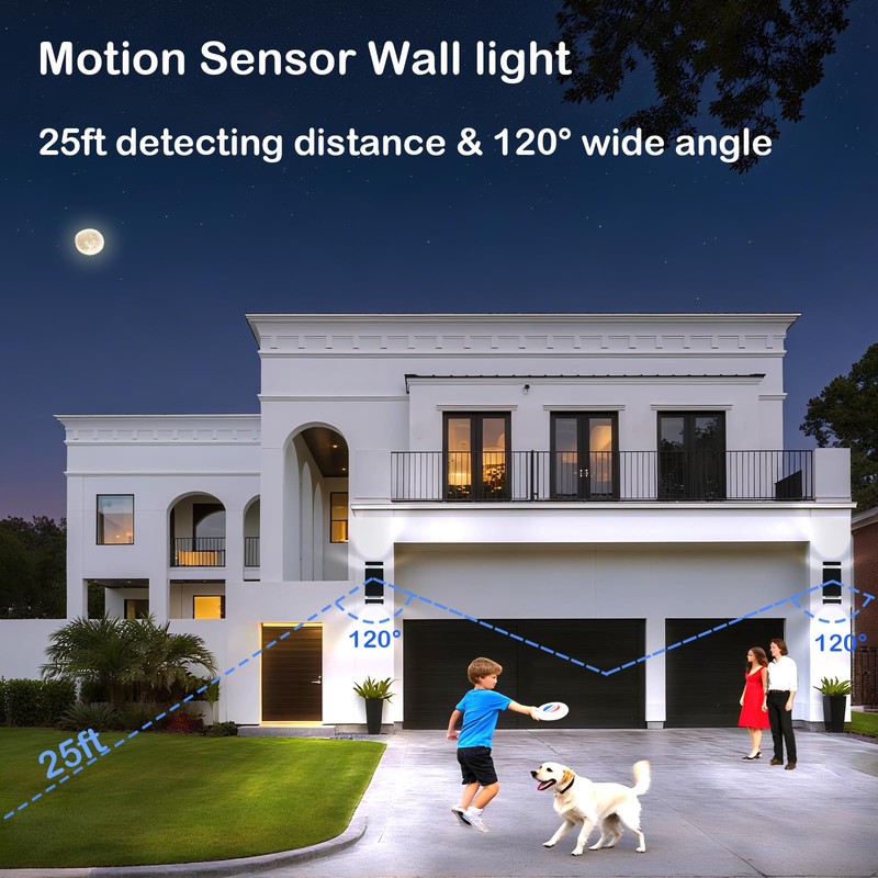 - Efficient Dusk to Dawn Motion Detection:Dusk to dawn motion sensor outdoor light turns on automatically at night and off during the day, featuring a PIR sensor that detects up to 30ft at a 120° angle.