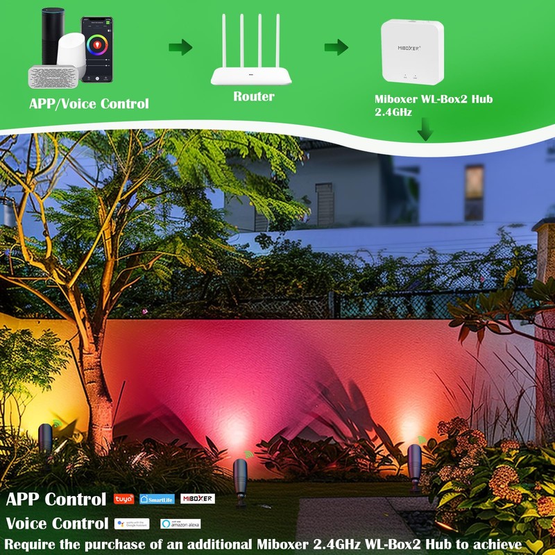- Remote & Intelligent Control: Outdoor low voltage landscape lights come with various control methods, with the Mi.light RF remote control (not included) sufficiently meeting your needs; once paired, you can effortlessly select from a range of RGB colors and adjustable white light, ideal for creating festive moods on special occasions like Christmas or Halloween; additionally, enjoy APP and voice control through the smart life or tuya smart app by using the 2.4GHz WL-Box2 Miboxer hub.