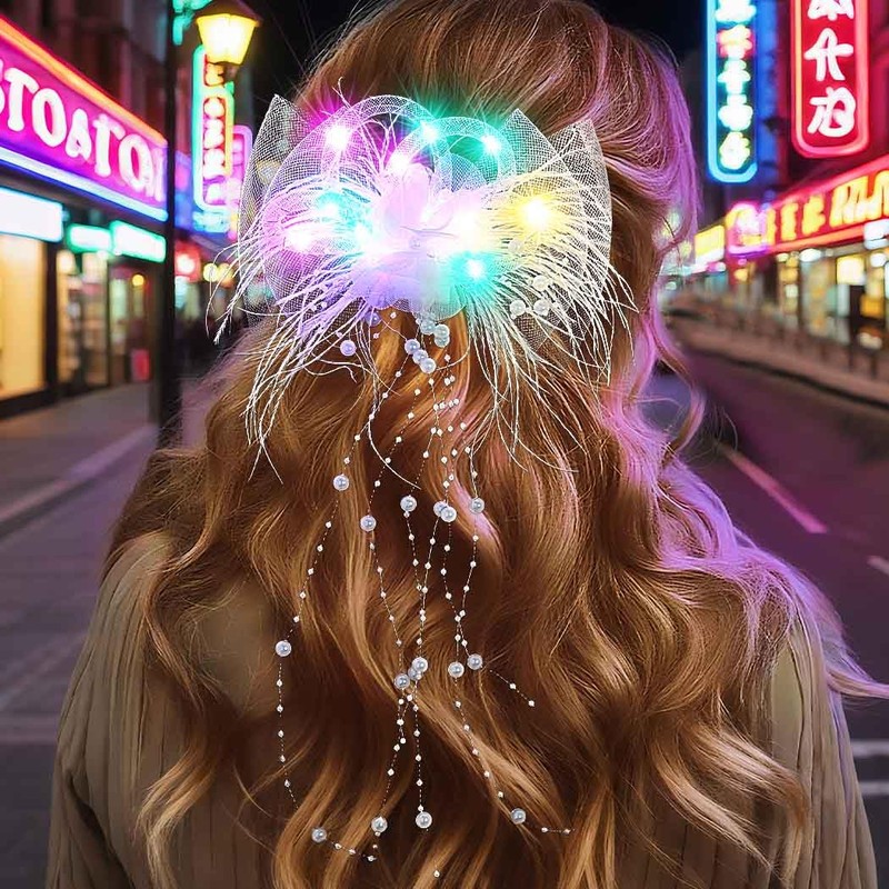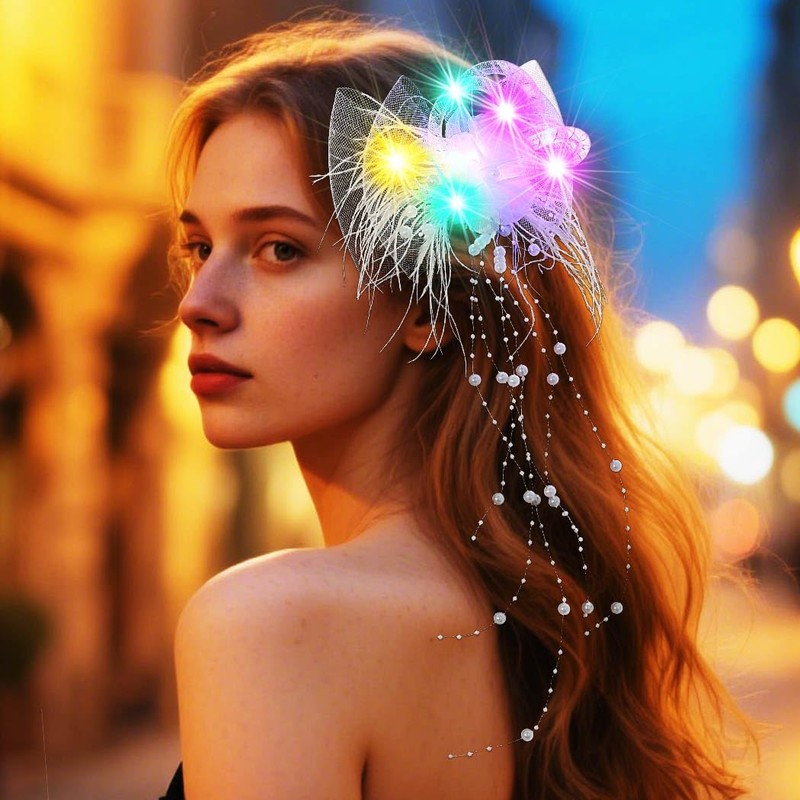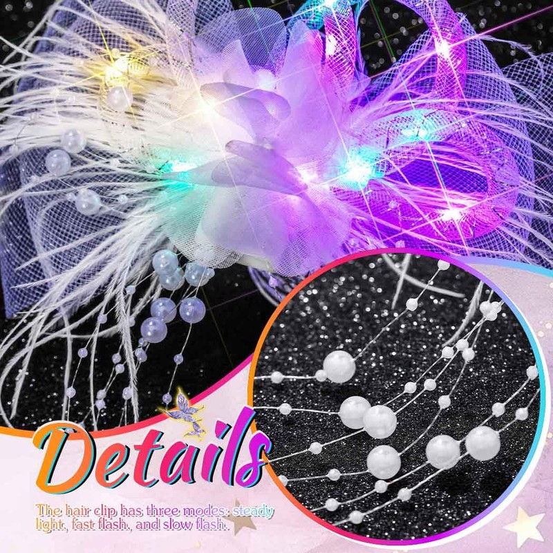 - Die Haarspangen mit Feder-LED-Licht bestehen aus Federn, Netzschleier, Blumen und LED-Licht. Sie leuchten hell, wenn sie nachts getragen werden.
