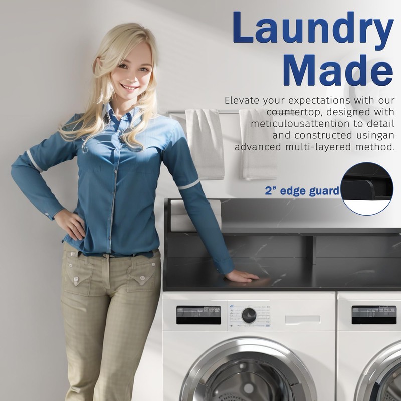 - Sleek and Modern Design: Our countertop features a sleek, modern design that effortlessly complements any home decor style. Its minimalist elegance adds sophistication to your laundry area without overwhelming the space. The rounded edges not only enhance its aesthetic appeal but also prioritize safety by eliminating sharp corners.