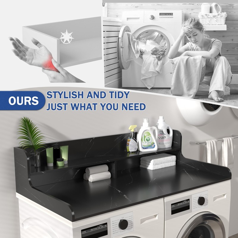 - Efficient Storage Solution: Offering exceptional storage capacity, it provides ample space for laundry detergents, fabric softeners, and other essentials. More than just a platform for your washing machine and dryer, this versatile countertop can be used for sorting, organizing, or even as a temporary workspace.