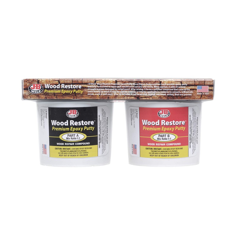 J-B Weld Wood Restore Premium Epoxy Putty – Repair Compound is a hand mixable epoxy putty specially formulated to repair and rebuild wood quickly and easily. When applied it adds structural strength to areas of damaged or rotted wood. It can be used to fill, build, reinforce or bond wood surfaces. After mixing, it forms a polymer compound that cures to the same density as wood. It may be used for exterior or interior applications; contains no solvents; will not rot, shrink, crack or pull away. After 60 minutes, it can be sanded, tapped, machined, dripped, filed and painted.