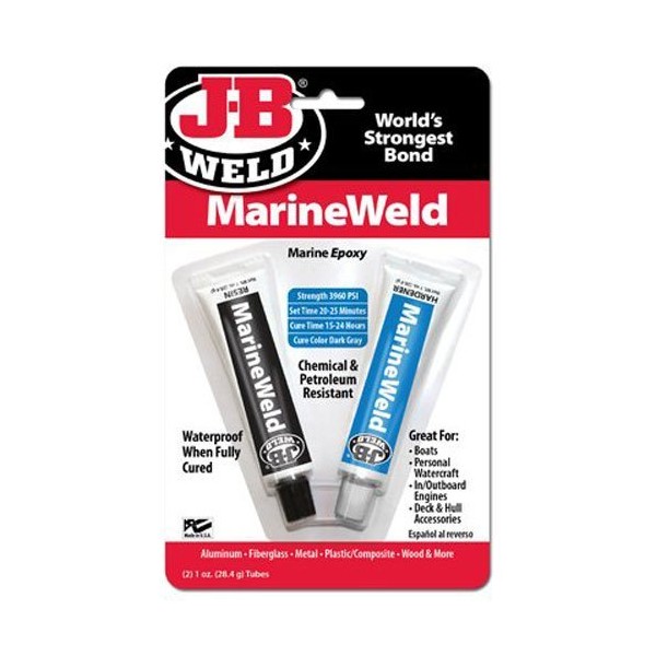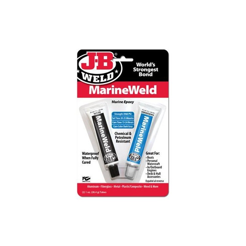 * Epoxy and Adhesives * Fiberglass * Under Water/Wet * And more **Instructions** **1\. Prepare:** Clean surface area of dirt, grease, oil, paint, or loose debris. For best results use a detergent or degreaser to first clean the surface, then roughen surface with file or coarse sandpaper to provide the best repair. **2\. Mix:** Squeeze equal parts from each tube onto a disposable surface and mix thoroughly. **3\. Apply:** Apply with appropriate tool in an even coat, weld bead or extruded shape as needed. **4\. Dry:** Sets in 4-6 hours. Cures in 15-24 hours. Allow 4-6 hours before handling and 15 hours (minimum) before putting object back in use. J-B Weld is proudly made in the USA Two-part epoxy cold weld system specially formulated for marine applications;Great for bonding aluminum, metal, composites, fiberglass and more;Sets in 4-6 hours at room temperature and cures dark grey in 15-24 hours;Once cured, it can be shaped, tapped, filed, sanded and drilled and will retain i
