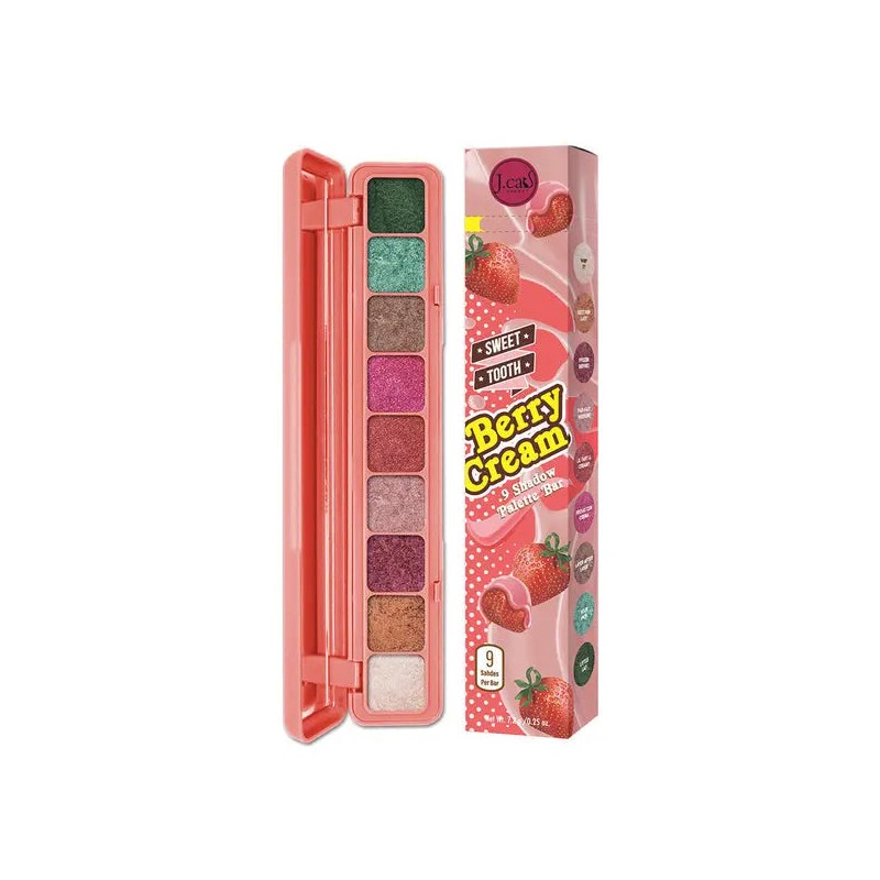 The J.Cat Beauty Sweet Tooth 9 Shadow Palette Bar Berry Cream is a delightful treat for your eyes! This compact palette features nine creamy shimmer eyeshadows in soft, sweet shades inspired by your favorite desserts. From dreamy berry pinks to subtle green accents – perfect for creating both soft and bold eye looks.