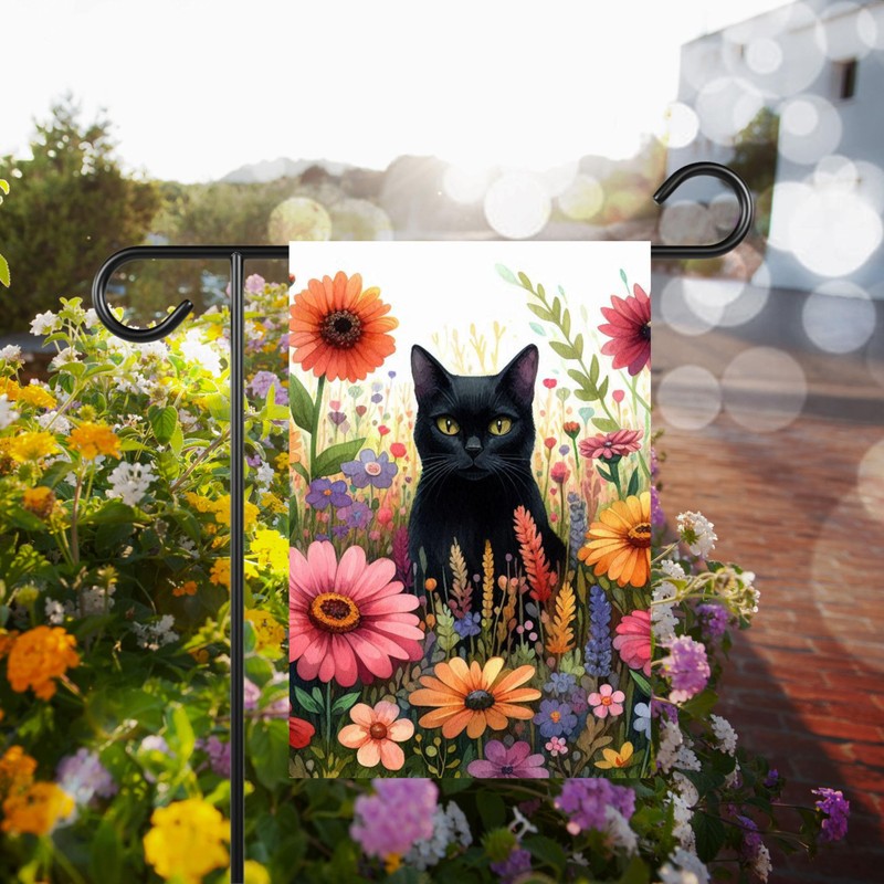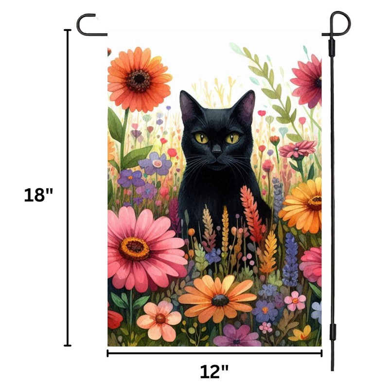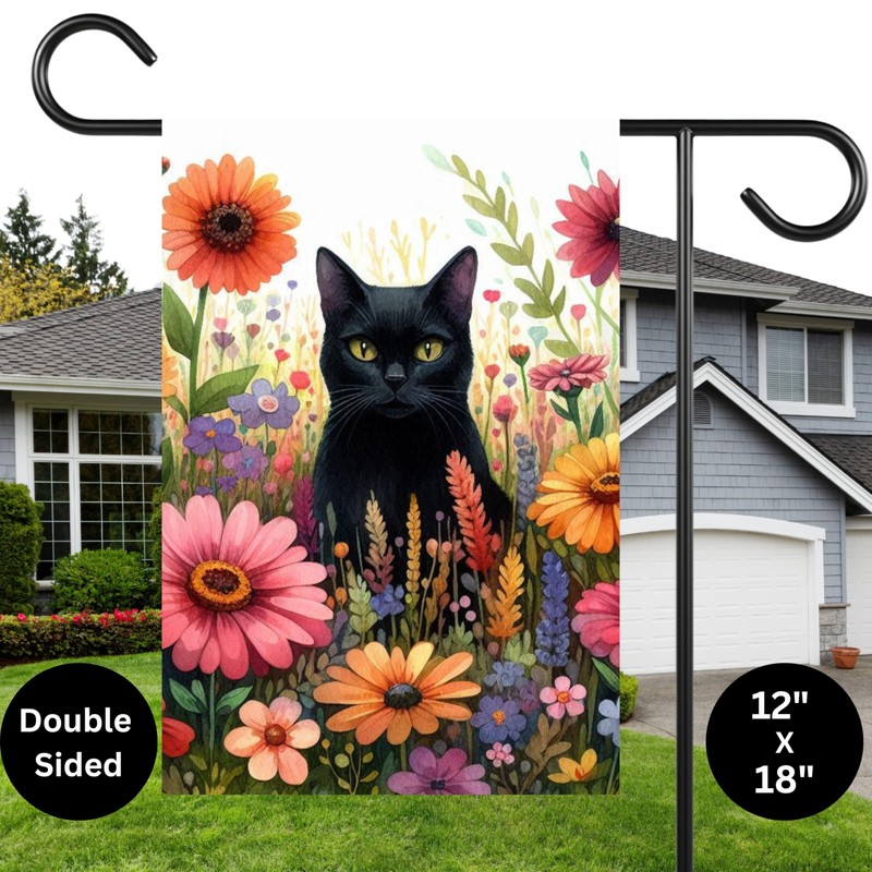 - Charming Design for Cat Lovers: Adorable black cat nestled among vibrant orange, pink, and purple wildflowers brings a cozy, welcoming feel to any outdoor space.