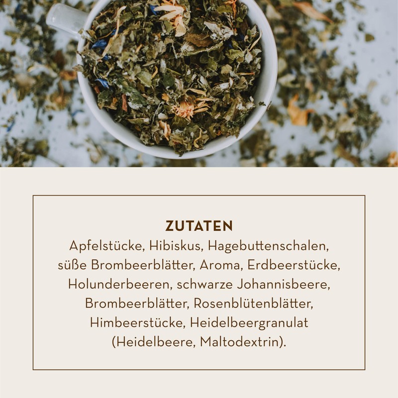 - Berry taste: these berries have grown up in the forest. They are rough and wild. They will rob your heart - with their intense berry taste. The culprits are called Hollunder, Wine, Bromine and Blueberry. They make this tea pleasantly fruity and berry-sweet. So you can't be angry at all.