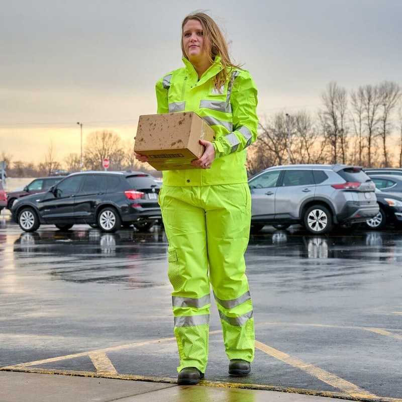 - Women’s High Vis Rain Jacket: High visibility rain gear is a type R class 3 women’s raincoat that is ANSI compliant to keep you visible and safe in the rain. High visibility rain jackets are lime green with a removable hood and multiple pockets.