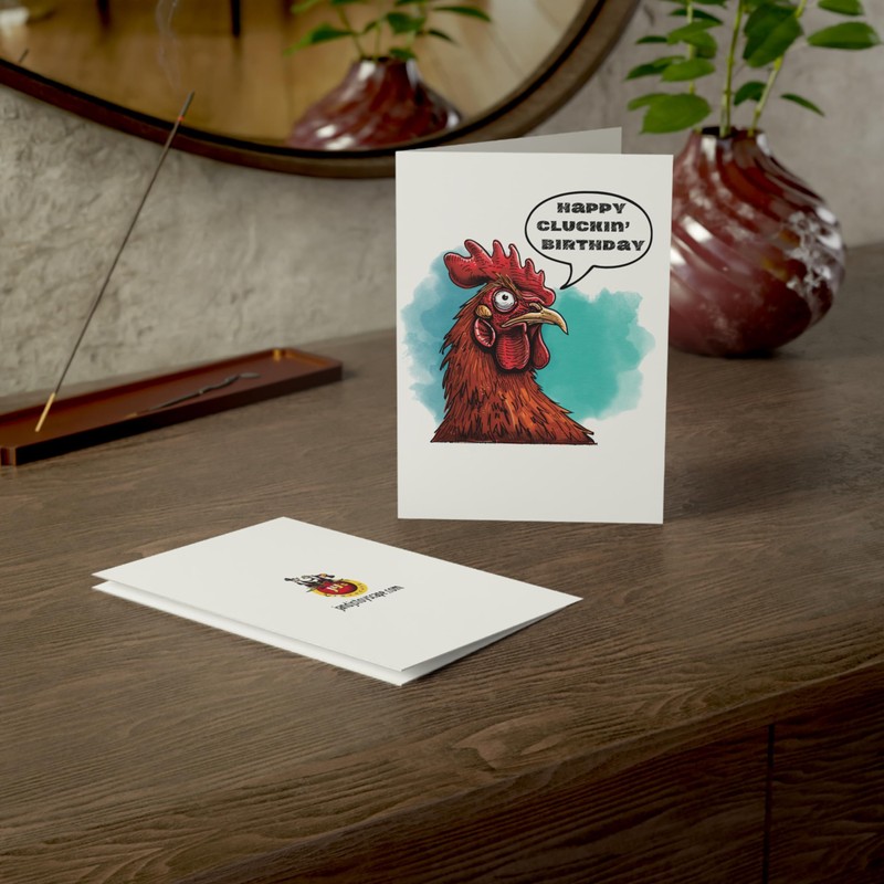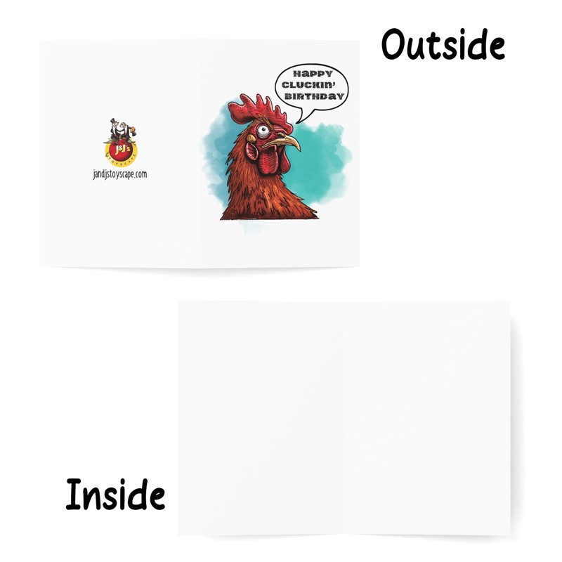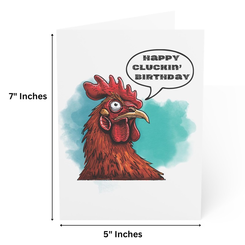 - The front of this birthday card features a rooster with a speech bubble containing the words "Happy Cluckin' Birthday"