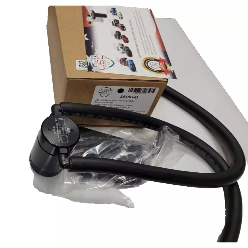 New J&L / JLT black driver side oil separator/ catch can for 1999-2004 Ford Mustang Cobra with 4.6 Dohc engines