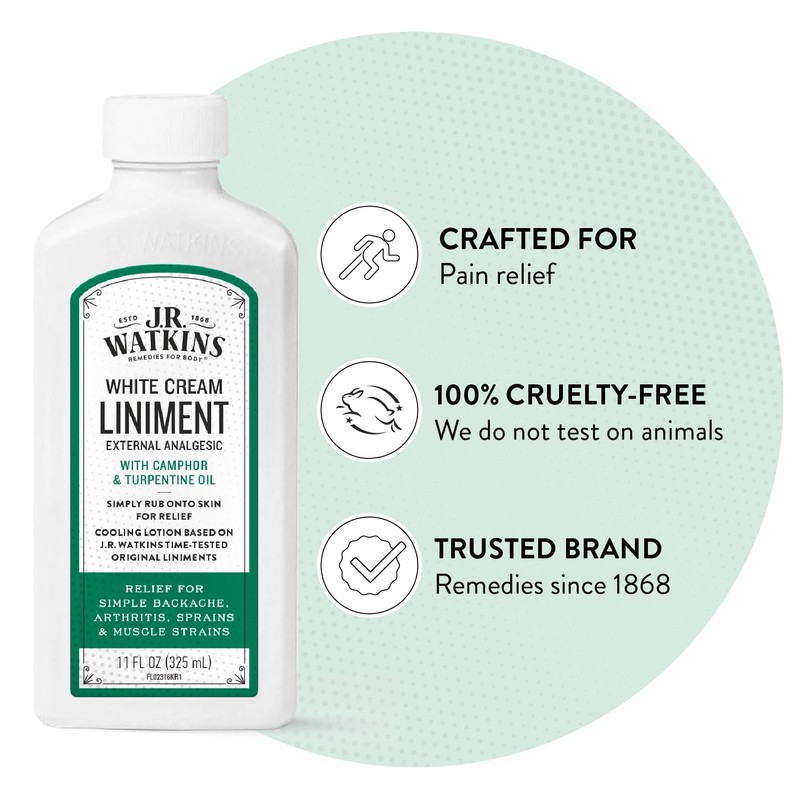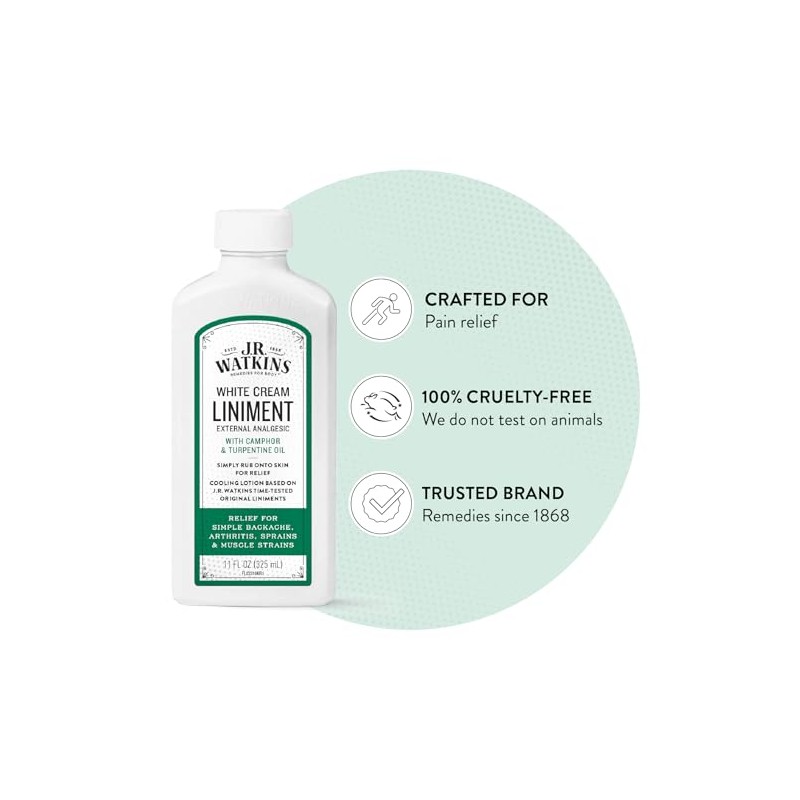 A Closer Look: J. R. Watkins White Cream Liniment uses evergreen based counter-irritants to provide relief from pain in the muscles and joints. The active compounds get active on rubbing and penetrate through the skin. The relief is temporary and is effective for muscular pain and sprains. The application can be absorbed easily and can keep the skin free of dryness.