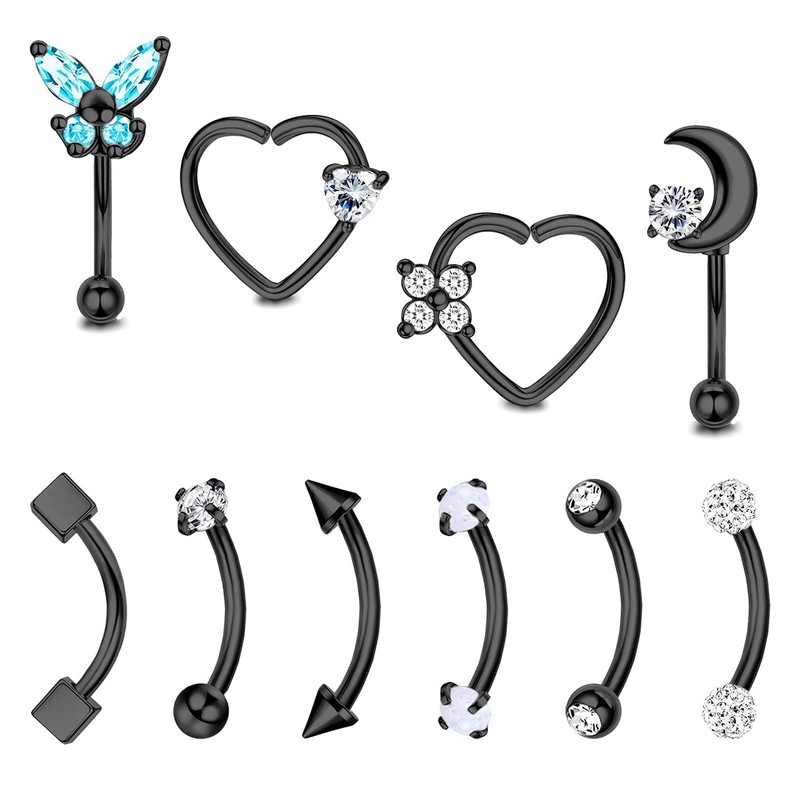 J-Style 10 Piece Set, Women's Helix Earrings, Eyebrow & Lips, Stainless Steel Earrings, Navel, Heart, Butterfly, Moon, Screw-type, Zircon Hypoallergenic, Simple, Birthday, Gift, Christmas, 10 Pieces,