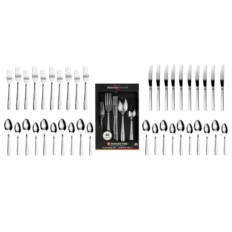 • COMPLETE SET: 40-piece flatware set includes 8 complete place settings with dinner forks, dinner spoons, salad forks, teaspoons, and dinner knives