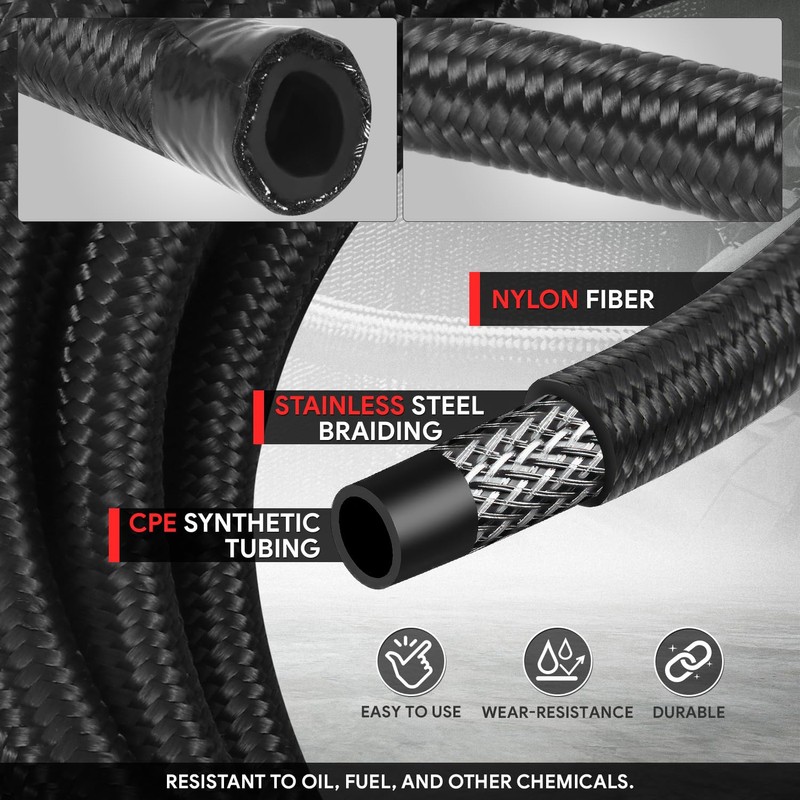 - 【8AN Fuel Line】Nylon fiber and stainless steel braiding protects fuel lines against abrasion and wear; High-quality CPE material resists deterioration and maintains flexibility; Resistant to oil, fuel, and other chemicals; Offers excellent fuel flow and pressure continuity for enhanced engine performance
