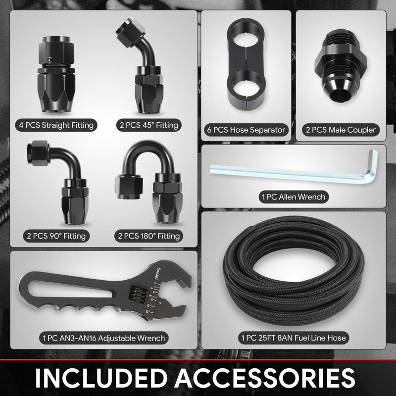 - 【Package Includes】1 x 25FT 8AN Black Nylon Braided Fuel Line; 4 x 8AN Straight Swivel Hose End; 2 x 8AN 45 Degree Swivel Hose End; 2 x 8AN 90 Degree Swivel Hose E; 2 x 8AN 180 Degree Swivel Hose End; 2 x 8AN Male Coupler; 6 x 8AN Hose Separato; 1 x AN3-AN16 Adjustable Wrench; 1 x Allen Wrench