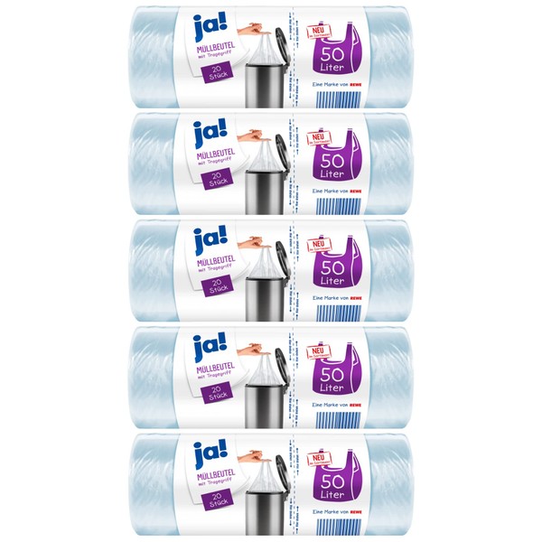 ja! 100 Trash Bags with Carry Handle, 50 Litres, 20 per Roll, Tear Resistant Bottom Seam, Transparent, 5 Rolls