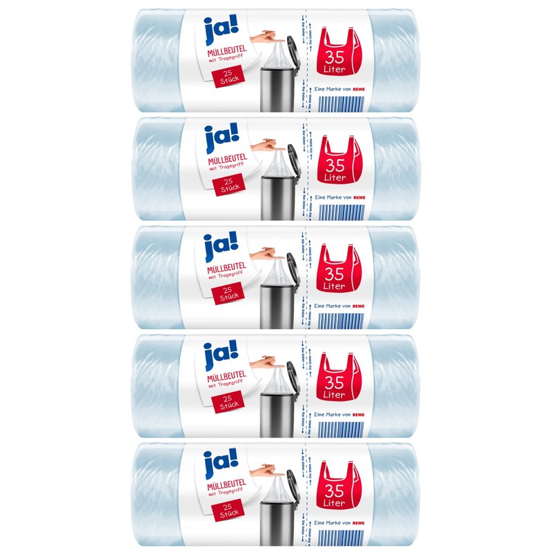 ja! 125 Trash Bags with Carry Handle, 35 Litres, 25 per Roll, Tear Resistant Bottom Seam, Transparent, 5 Rolls
