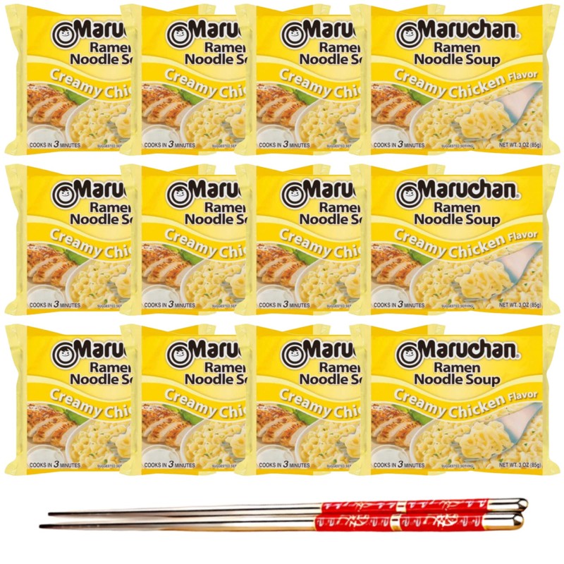 - VALUE PACK: Enjoy 12 individual packs of delicious Creamy Chicken-flavored Ramen 3 ounce each pack. Bundle with 1 Stainless Steel Chopsticks, 8.9 inches long.