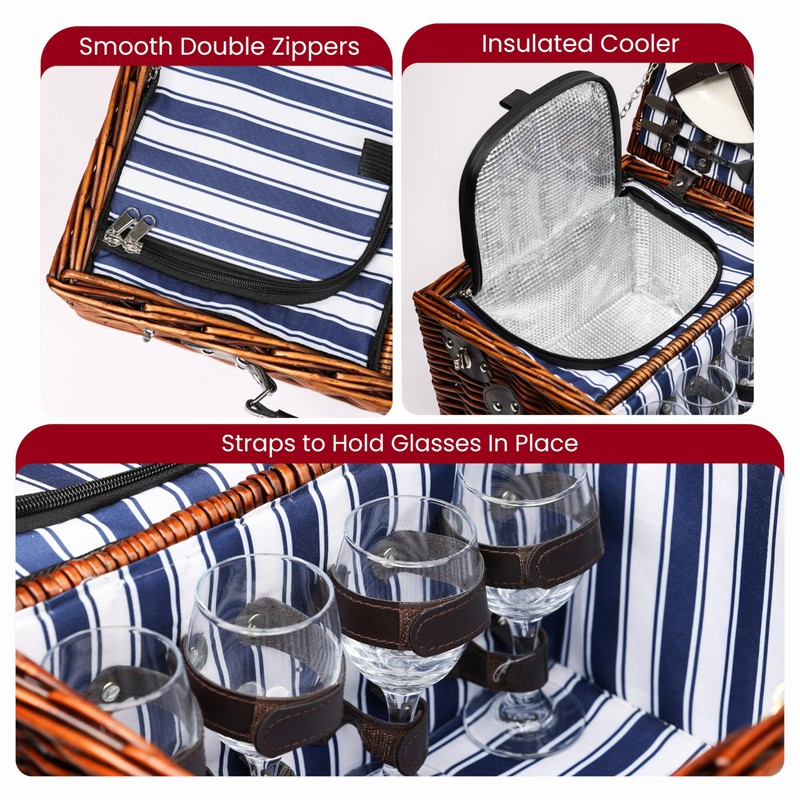 - Leather straps inside the basket keep plates, silverware, and additional accessories neatly organized and ready for use.