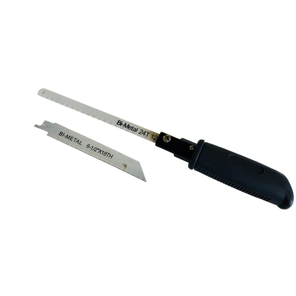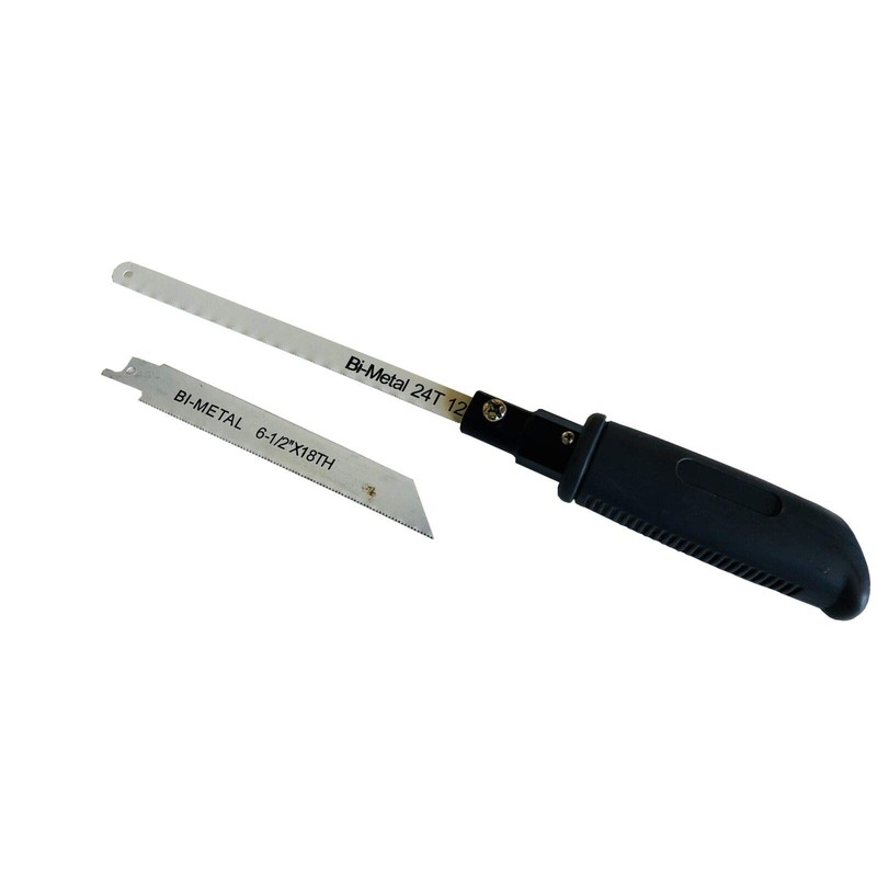 This interchangeable set contains two different blades, a 6.5" TPI for metal cutting and a 12" bi-metal hacksaw blade. It can serve many purposes with its strong coat, including metal and wood trimming or cutting. The handle is cushioned with an adjustable and non-slip grip for a firmer and safer hold. This will also accept any standard and reciprocating blades.