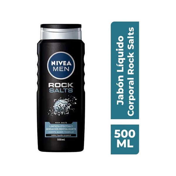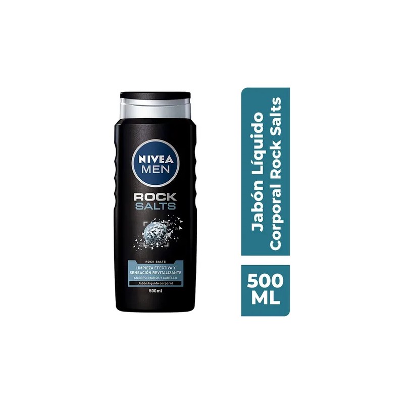 NIVEA MEN Rock Salts Jabón líquido corporal ofrece una limpieza profunda y revitaliza la piel. Experimenta una ducha única con su fórmula enriquecida con sales de roca, que proporciona un cuidado intenso y una limpieza profunda. Este jabón corporal cuenta con una fragancia masculina y refrescante, y se transforma en una espuma protectora que revitaliza la piel. Apto para uso diario, se debe evitar el contacto con los ojos. Para aplicar, humedecer las manos o una esponja y frotar sobre el cuerpo hasta crear espuma, luego enjuagar.