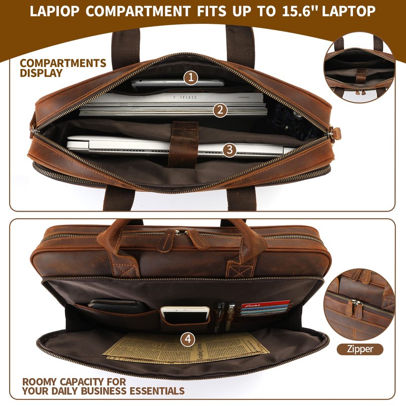 - New Arrival leather briefcase! Dimension: 17.5*12.3*2.83 inches (44.5*32*7.2cm), This mens briefcase fits up for 15.6" laptop.