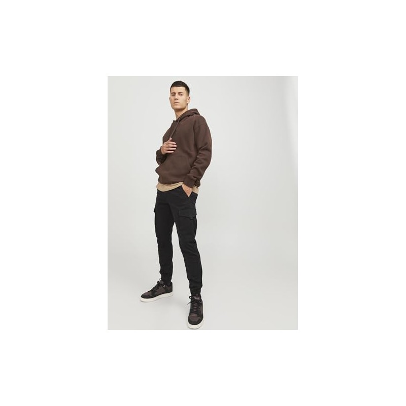 DescriptionSturdy and casual are these cargo pants by JACK & JONES. The pants made of canvas fabric, have side pockets like a chino and back pockets with flaps. In the for cargo pants indispensable pockets on the lateral thighs, any small items can be stowed.