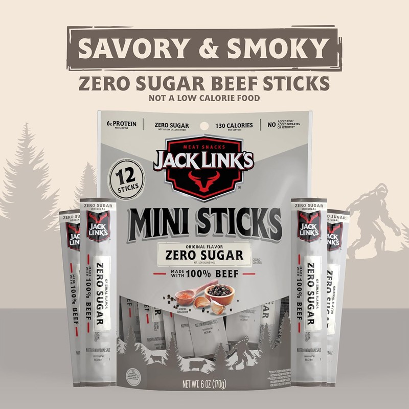 Jack Link’s Original Mini Zero Sugar Beef Sticks: We start with 100% beef and add our signature blend of spices and smoke it real slow for that classic flavor America loves. Plus, with 6g of protein per serving, Jack Link’s Mini Zero Sugar Beef Sticks are the protein snack you need to help you power thru your day. With Zero Sugar, they're a better for you snack that meat eaters love. They’re portable, too, and go where you go: One-handed snacking is the way to go when you and your family are on the move. Whether you're pantry packing, lunch boxes filling, snacking on the go or in need of a meal substitute during a busy workday, Jack Link’s protein snacks are the fuel for people to Feed Their Wild Side, no matter the occasion. Our mini sticks are a satisfyingly savory protein snacks for you and your family with a simple, delicious and convenient source of protein at an exceptional value.
