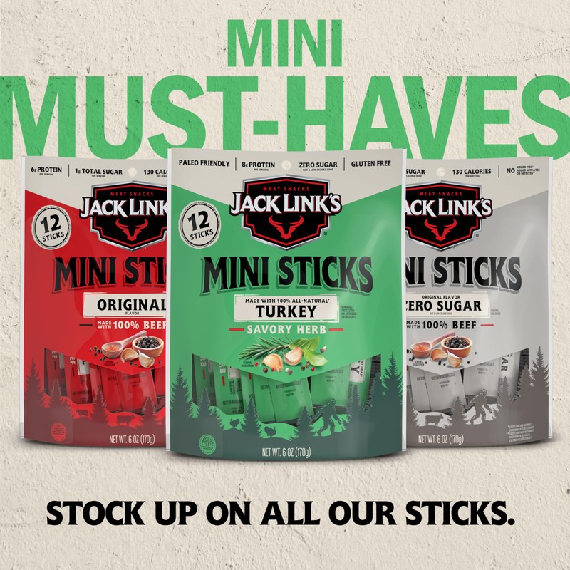 Jack Link’s Original Mini Turkey Sticks: We start with 100% turkey and add our signature blend of spices and herbs for a bold flavor. Plus, with 8g of protein per serving, Jack Link’s Mini Turkey Sticks are the protein snack you need to help you power thru your day. They’re portable, too, and go where you go: One-handed snacking is the way to go when you and your family are on the move. Whether you're pantry packing, lunch boxes filling, snacking on the go or in need of a meal substitute during a busy workday, Jack Link’s protein snacks are the fuel for people to Feed Their Wild Side, no matter the occasion. Our mini sticks are a satisfyingly savory protein snacks for you and your family with a simple, delicious and convenient source of protein at an exceptional value.
