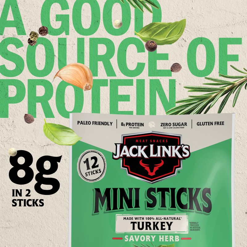 Jack Link's Mini Turkey Sticks, Savory Herb Flavor – 8g of Protein Snacks, Under 100 Calories, On the Go Snacking, Keto & Paleo Snack, Carnivore Diet Ready, Individually Wrapped, 0.5 Oz. (12 Count)