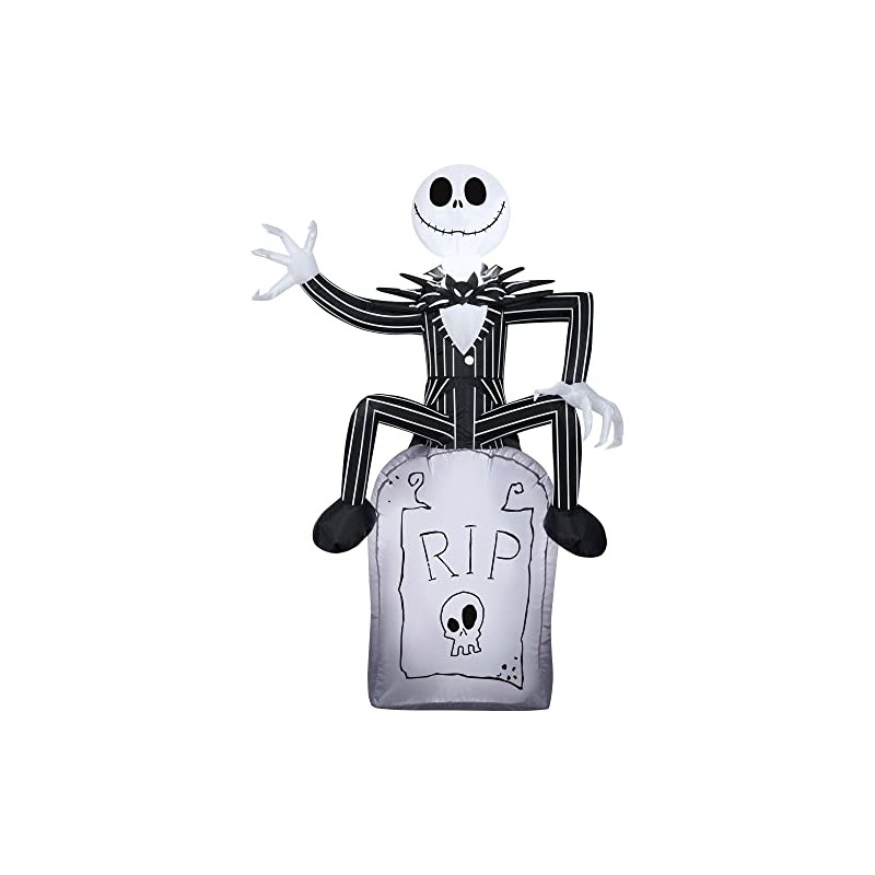 Greet your guests and neighbors with this amazing Airblown inflatable character. Gemmy Jack Skellington on Tombstonesits and smiles for this fun Halloween scene. Setup is super simple. Just plug it in, stake it down and watch the magic unfold. Display this spooky decoration as a standalone or combine it with other Airblown Inflatables to create a custom scene. Includes everything needed for easy outdoor setup. Key FeaturesLights upSelf-inflates in seconds for easy setupIncludes stakes and tethers for outdoor setupDeflates for easy storageFor indoor or outdoor use