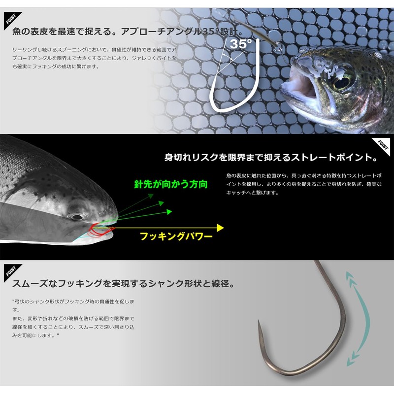 - Concept: [35SP] ... Contact is what you want. Specially designed spooping hook that allows the bait to catch in high dimensions. Straight point [35°] design A spoon specific hook that exhibits its its function during continuous reeling, with high sensitivity, low elongation, and high elastic tackles