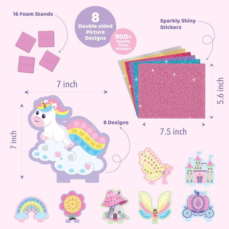 - DIY SPARKLY MOSAIC STICKERS KIT: This kit comes with 900+ sparkly, shiny and glittery stickers with 8 high-quality double sided card cutouts and a foam stand to decorate and display fairyland-themed objects.