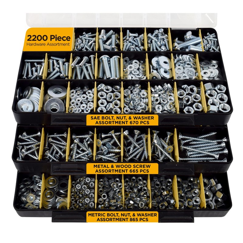 - More Sizes and Pieces: 2,200 pieces and 62 different hardware sizes. Screws: 19 sizes and 665 pieces of Wood and Sheet Metal Screws. Sae: 22 sizes and 670 pieces of Bolts (Phillips Head), Hex Nuts, and Washers. Metric: 21 sizes and 865 pieces of Bolts (Phillips Head), Hex Nuts, and Washers.