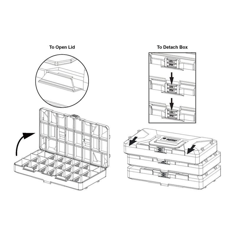 - No-Mix Compartments: Interlocking lid prevents hardware from mixing and removable nested dividers can be re-arranged for further customization.
