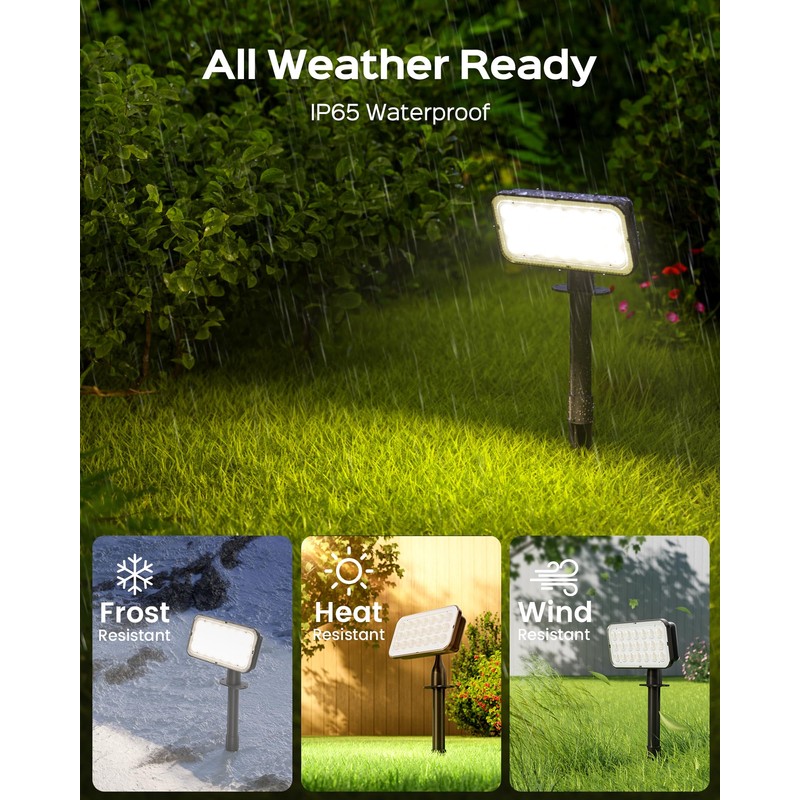 - Made for Outdoor Weathers: IP65-rated solar lights outdoor waterproof are built for outdoors to endure rain, snow, heat, wind, and extreme temperatures. Whether you're driving home or lighting up your garden and trees at night, you’ll get reliable performance year-round with little to no maintenance required.