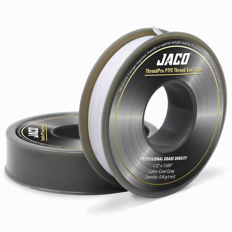When working with pipes, valves, and various fittings, we all know the annoyance of leaks. Even more aggravating is exacerbating the issue with low-quality, flimsy teflon tapes. That's precisely why we at JACO have developed the ultimate PTFE tape you'll ever need—it's built to last longer, seal stronger, and surpass all other thread sealing tapes on the market. We're proud to introduce the ThreadPro PTFE Thread Seal Tape, crafted by JACO's experts, leveraging over 35 years of industry experience. The specs are impressive: a tape width of 1/2 inch, a roll length of 1200 inches (100 feet), available in a single pack with a density of 0.8 g/cm³, and in a distinguished light gray color. However, it should not be used with natural gas, propane, methane, butane, or petroleum, and a minimum of three wraps around threaded joints is recommended for an optimal seal. ThreadPro is professional-grade, ideal for a broad spectrum of applications in industrial, commercial, and home settings—including automotive, plumbing, water and gas lines, shower heads, air compressor fittings, and pneumatic tools. Its high-density composition is an ultra-strong "plumber's tape" engineered to halt leaks, prevent damage, and enhance the performance and flow of your equipment. Versatile by design, it works effectively with a multitude of materials such as brass, iron, aluminum, stainless steel, galvanized steel, PVC, plastics, fiberglass, polyethylene, polypropylene, and more. Its durability is unmatched—it won't harden, crack, or disintegrate over time.