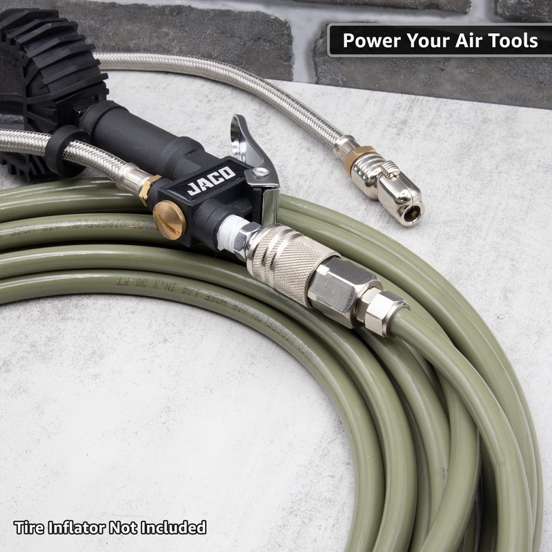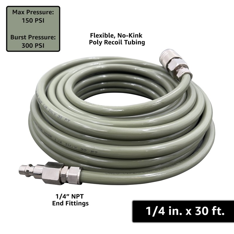 - Easy-to-use - using an air hose shouldn't be frustrating. Our poly air hose is easy to move around, and will effortlessly uncoil to any length you need up to 30 feet, and quickly recoil back when the job is done.
