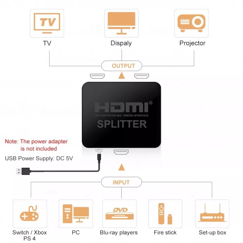 This 4K HDMI splitter requires a 5V USB power source (not included), and simply connects to a USB wall charger using the included USB cable. It's important to note that HDMI cables are not included, so you will need to have your own.